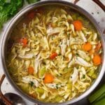 This homemade chicken noodle soup recipe offers a comforting and flavorful bowl of classic goodness made from scratch. Tender chicken breasts simmered in a savory broth with sautéed vegetables, fresh herbs, and perfectly cooked egg noodles make for a satisfying and nourishing meal perfect for any day of the year.