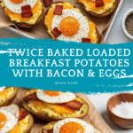 Keywords: twice baked potatoes, breakfast potatoes, loaded potatoes, stuffed potatoes, baked eggs, beef bacon, cheddar cheese, brunch recipe
