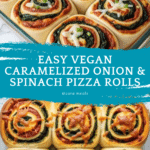 Keywords: vegan pizza rolls, caramelized onion pizza rolls, spinach pizza rolls, vegan appetizers, plant-based snacks, homemade pizza dough, savory vegan rolls