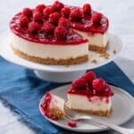 Store the cheesecake covered in the refrigerator for up to 5 days or in the freezer for up to 2 weeks. To serve, thaw in the refrigerator for several hours or overnight, then bring to room temperature for about 30 minutes before enjoying. Leftover raspberry topping can be refrigerated separately for up to a week.