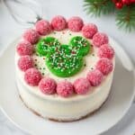 - Decorate the Cake: Optionally stencil the cake top for a wreath design using biscuit cutters. Tint about ½ cup of frosting with green gel food coloring and pipe mini rosettes using tip Wilton 106 or 1M for larger cakes. Garnish with candied cranberries and festive sprinkles as desired.