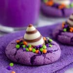 Witch Hat Cookies are a fun and festive Halloween treat featuring soft, peanut butter-flavored cookies coated in purple sanding sugar or sprinkles and topped with melty chocolate kisses. These adorable hat-shaped cookies are perfect for parties or holiday celebrations with their vibrant color and rich flavors.